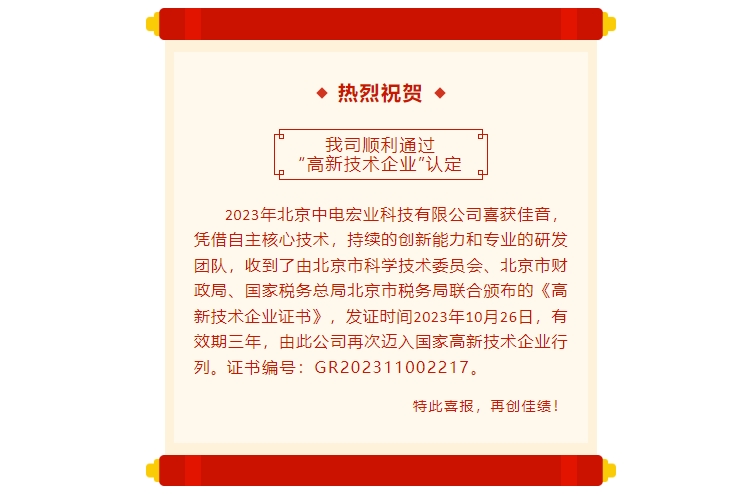 北京中電宏業科技有限公司喜獲佳音,順利通過“高新技術企業”認定